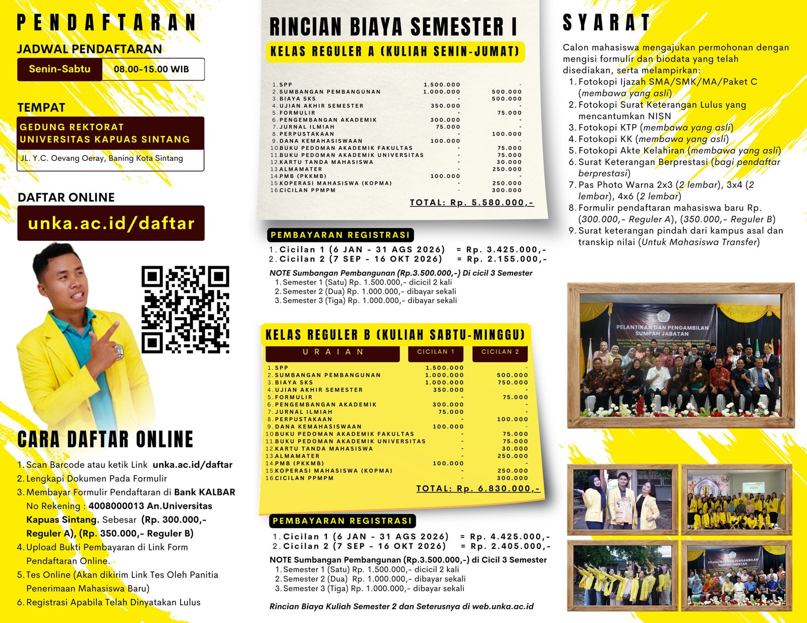Calon mahasiswa dapat mendaftar dengan mudah melalui laman resmi unka.ac.id/daftar atau datang langsung ke Gedung Rektorat Universitas Kapuas Sintang, Jalan Y.C. Oevang Oeray, Baning Kota Sintang.
